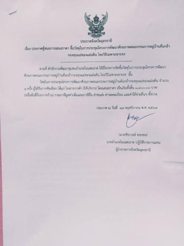 ประกาศผู้ชนะเสนอราคาจัดซื้อวัสดุโครงการพัฒนาศักยภาพคณะกรรมการหมู่บ้านต้นกล้ากองทุนแม่ของแผ่นดิน